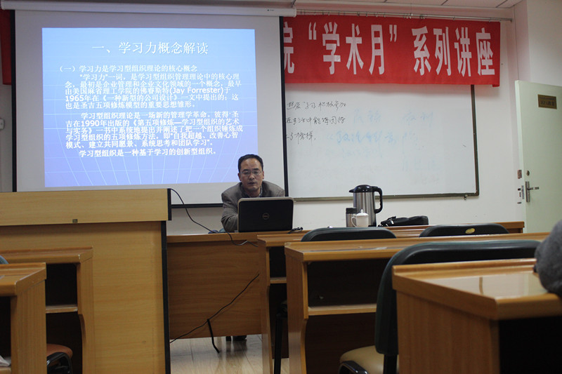 刘磊教授从“学习力概念的解读”、“学习力结构”、“创新”三个方面进行了系统的阐述,他认为,学习力是人们在学习和实践过程中形成和不断发展的以理解力为核心的发现问题、分析问题、解决问题的能力。其中,理解力是学习力的核心。随后,刘磊教授从组织行为学视角下对学习力进行了分析。他形象地把大树比作学习力,把理解力比作大树的树根,把发现问题、分析问题、解决问题的能力比作树干、把生存力、竞争力、发展力、创造力比作枝叶和果实,让同学们更深刻的理解了学习力的结构。最后,刘磊教授从“怎样理解创新”和“创新的重要性”两个方面对创新做了深刻的论述,指出,创新并非是一种单一的管理职能,但是它贯穿于生活生产中的每一个领域,无论在哪个领域都非常重要。