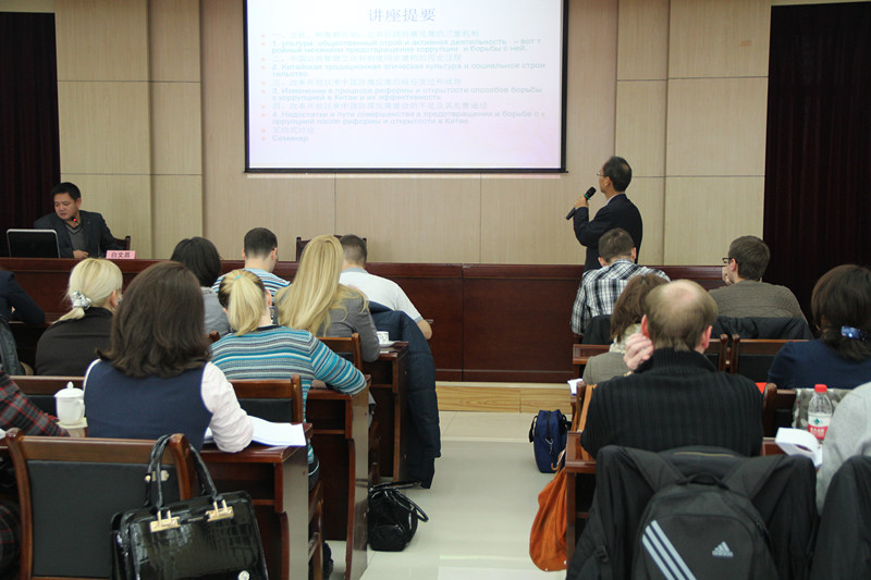 贾应生教授为俄罗斯联邦政府公务员培训班作了题为《公共服务伦理与国家防腐反腐政策体系》的专题报告。黑龙江大学俄语学院副院长白文昌教授担任翻译。