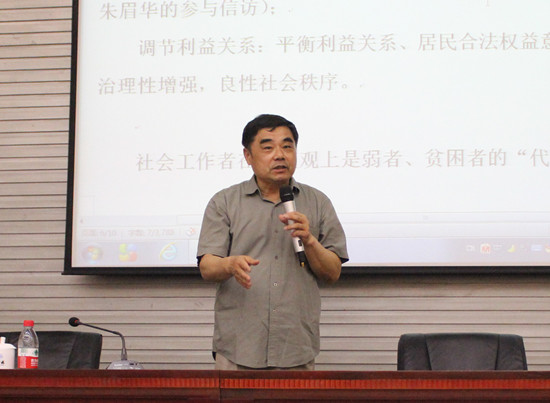 王思斌教授以“社会治理创新与社会工作的发展”为题,从五个方面做了阐述:首先,他认为在当前的社会形势即全面深化改革时期社会工作要取得发展空间,就必须以深化改革作为指引,积极寻求对策,推动社会工作合理有序发展。其次,从“社会管理到社会治理”这一层面进行分析,结合中央关于社会治理创新的战略部署和当前存在的现实问题,认为社会工作的发展需要通过治理方针的创新指引,才能明确发展方向。第三,社会治理创新离不开社会工作的深入参与和发展。为此,必须把握好社会工作的本质,着力发展社会工作的服务型治理模式。第四,从“社会工作参与社会治理的张力与理性选择”这一角度论述了在参与社会治理时应理性选择,以便寻求最优的治理方式。最后,王教授在参与社会治理创新中谋求更大发展的论述中对社会工作专业的未来做出了全新的展望和期待。