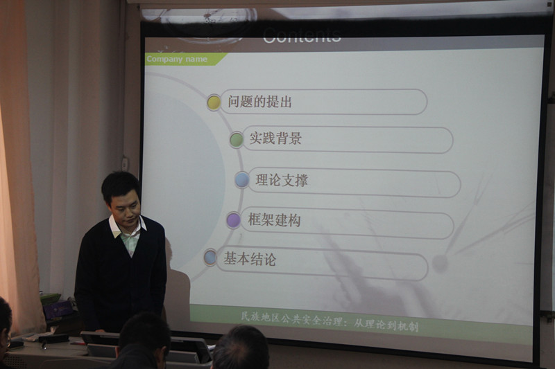 王海峰博士从问题的提出、实践背景、理论支撑、框架建构以及基本结论方面进行了陈述。针对问题的提出,他依据观察感受、制度与政策演进的脉络来提炼、归纳问题,使现实问题学理化,提升研究价值。他从原始族体、现代民族形成过程及民族识别工作前后等阶段对民族地区公共安全治理的演革作了历时形态的梳理,对当前民族地区公共安全面临的威胁、治理方式的特征作了共时性考察,阐述了从传统准稳模式走向公共安全治理的逻辑必然,指出治理转型在实践中必将落脚于民族地区公共安全治理机制的重构与有序运行。随后对理论支撑与民族地区公共安全治理机制的关联进行介绍:风险社会理论与治理客体类型化、治理理论与治理主体多元化以及机制设计理论与机制运行规范化,在“要素——规则——程序”的框架下探讨了民族地区公共安全治理机制设计和运行的基本思路。最后作了简要的总结与可引申的讨论:民族地区走出维稳困境依托于公共安全治理机制的设计和运行,治理机制要素构成上的合理程度是机制运行的基础、治理机制运行过程的区间化和系统化是动态治理的核心体现、治理机制的有序运行需要完善的法治保障等。