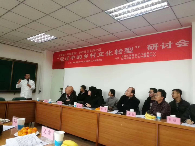 2017年12月23日,由社会发展与公共管理学院主办,甘肃沐润社会工作服务中心、兰州创晖社会工作服务中心联合协办的“变迁中的乡村文化转型”研讨会在西北师范大学教学10号楼D区503举行,关注乡村文化转型的高校教授、农民代表、诗人、艺术家、社会组织、基金会代表与银河官网 研究生等三十余人参会。