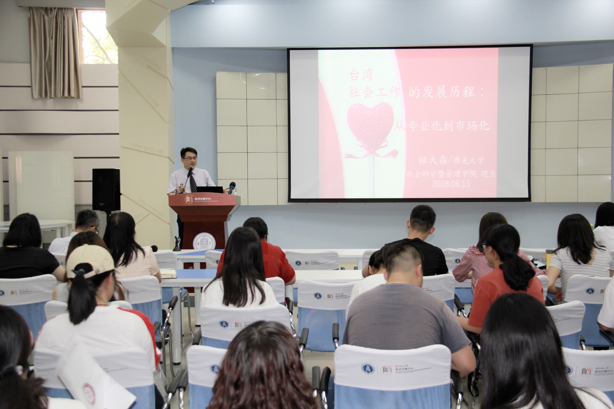 2018年6月13日16:30,台湾佛光大学社会科学暨管理学院院长、社会学系林大森教授应银河官网 邀请在教师发展中心学术报告厅作了题为“台湾社会工作的发展历程:从专业化到市场化”的专业学术讲座。银河官网 社会工作、社会保障等专业的研究生、部分教师约100多人参加,讲座由社会工作系主任马克林教授主持。