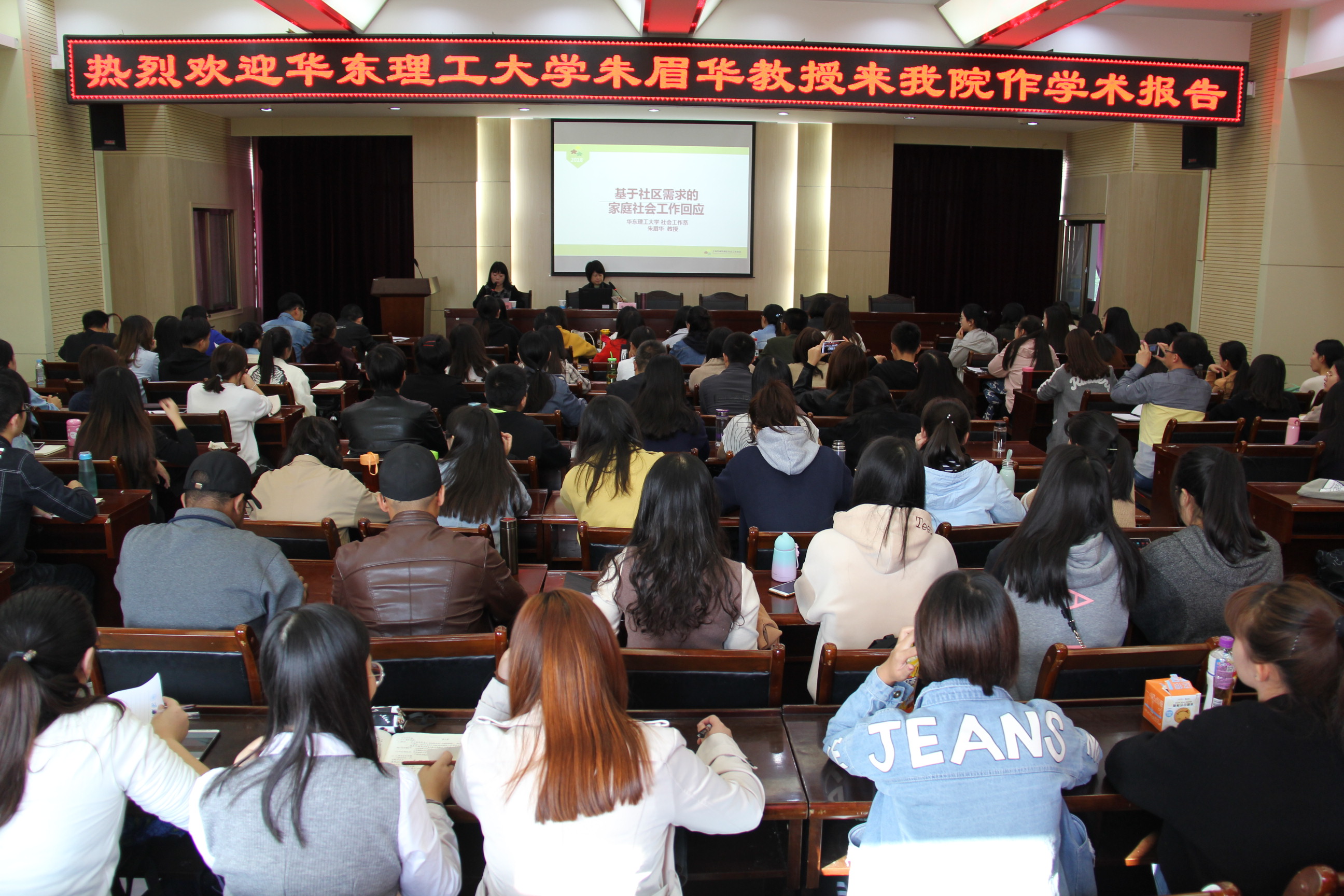 2018年10月12日下午,应银河官网 邀请,华东理工大学朱眉华教授在10号教学楼D区四楼报告厅作主题为“基于社区需求的家庭社会工作回应”的学术报告,讲座由银河官网 社会工作系陆春萍教授主持,来自本校与外校社会工作专业学习者、爱好者齐聚十教四楼报告厅近200人共同学习。