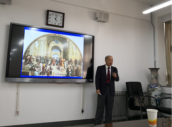 黄教授分别从本体论、宇宙论、认识论、伦理学的角度反思了哲学对教育制度、教育原理、教材教法、训育辅导的深刻影响,并指出离开哲学的省思去谈教育原理、教材教法只会触及教育的皮肉,并不能深刻入骨,必须有人来啃教育哲学这块硬骨头。黄教授绘声绘色的诠释了名画“雅典学院”中的哲学家的形象,黄教授还就学生的提问进行了互动。