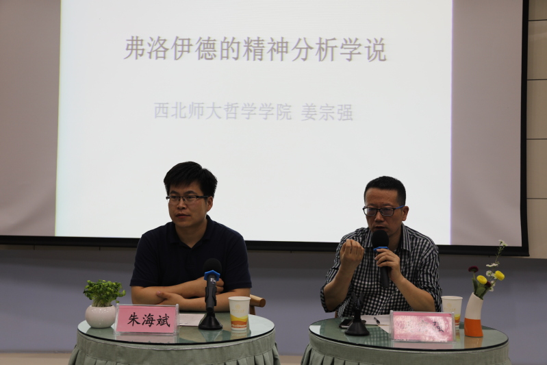 2019年6月25日晚,由西北师范大学哲学学院、中和集团、科学研究院与教师发展中心联合主办的“哲学沙龙——中和论道”第五十六期在西北师范大学教师发展中心如期举行,本期主题为“弗洛伊德的精神分析学说”。由西北师范大学哲学学院常务副院长姜宗强教授主讲,朱海斌博士主持。西北师范大学副校长李朝东教授,中和集团洪涛董事长,音乐学院李莉副院长,马克思主义学院牛正兰教授,哲学学院贺更粹博士、胡好博士以及来自其他学院的上百位哲学爱好者共同参与了此次学术活动。