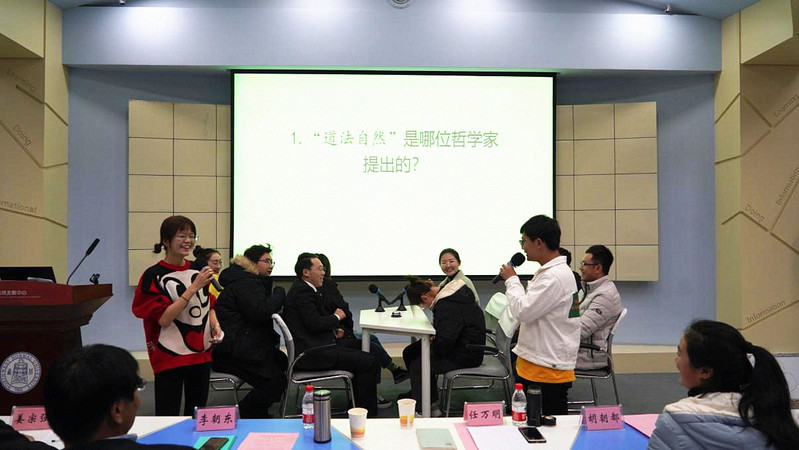 在“中外哲学知识竞猜”环节中,小组竞猜抢答和观众竞猜抢答两种形式交替进行。竞猜活动突出了抢答环节的设置,不仅让竞猜活动欢快与紧张并存,而且有助于锻炼同学们的反应速度和敏捷度。竞猜活动通过将游戏与哲学知识巧妙地结合了起来,让同学们在轻松愉快的氛围下体会到学习哲学的乐趣。