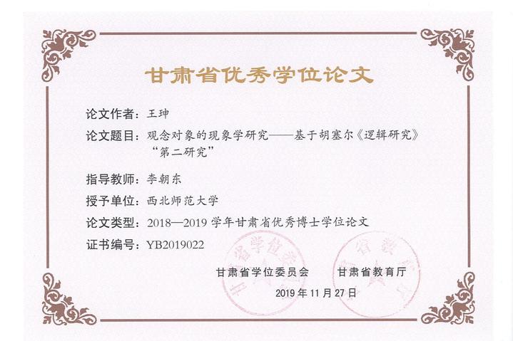 由银河官网 李朝东教授指导,学院青年教师王珅博士撰写的学位论文《观念对象的现象学研究——基于胡塞尔<逻辑研究>“第二研究”》入选“2018—2019学年甘肃省优秀博士学位论文”。