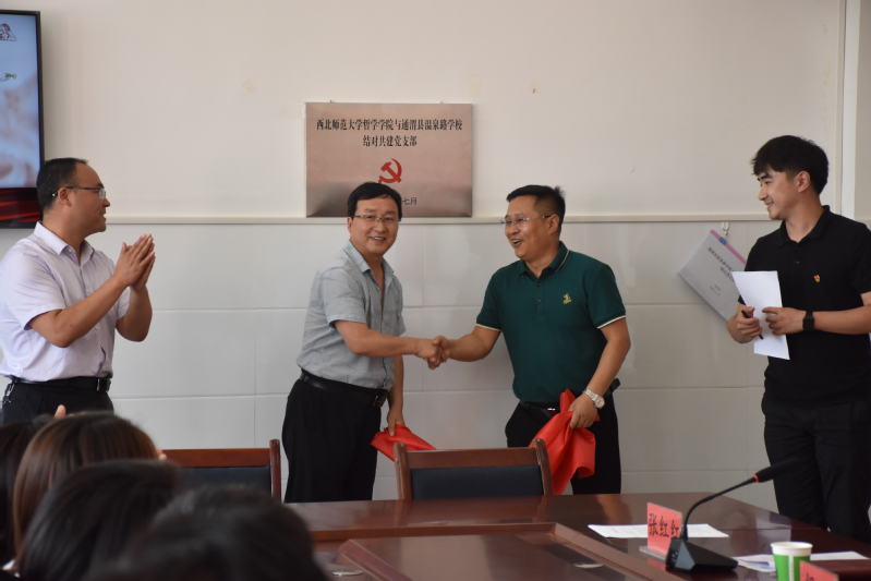 7月21日下午,在通渭县温泉路学校举行了支部共建签约揭牌仪式暨社会实践活动座谈会。学院社会实践小分队师生代表、通渭温泉路学校教师代表共计30余人参加了座谈。在会上,通渭县温泉路学校党支部书记张红红与学院学生第二党支部书记梁凯博共同签订了党支部共建协议,通渭县教育局党组成员、教育党工委副书记陈启明与学院党总支副书记黄长军为结对共建党支部揭牌。本着“优势互补,携手共建”的原则,两个支部结对共建,积极探索高等学校与基础教育共促党建、共谋发展的新思路。与会师生代表在会上纷纷发言,协商推进支部共建、教师培训、社会实践等落实落地的长效机制。