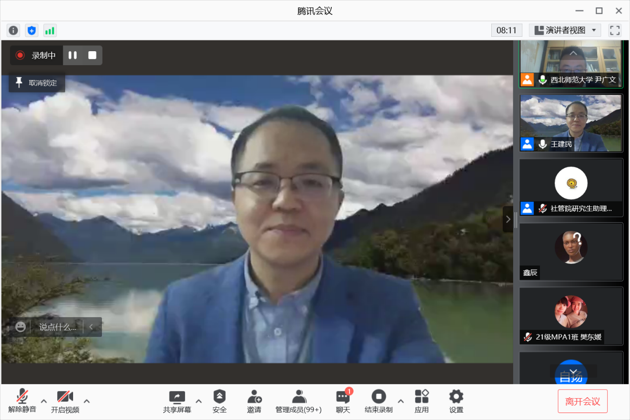 新冠肺炎疫情期间,大家“足不出户”隔离病毒,但疫情无法阻碍师生求知若渴的心灵。2021年11月4日晚,应银河官网 邀请,中央财经大学社会学系教授、系主任王建民教授在腾讯会议为西北师范大学社会发展与公共管理学院师生带来了题为:“诗与士人的精神世界——试以王维的生命史与编年诗为例的社会学探索”的学术讲座。
