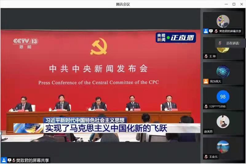 1112日上午,哲学学院组织全院师生线上收看党的十九届六中全会精神新闻发布会。新闻发布会后,学院党总支理论中心组、各党支部和学生团支部利用主题党课、团课等方式组织开展专题讨论,深入学习全会精神,畅谈心得体会。