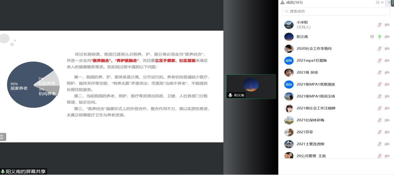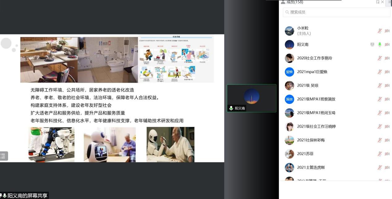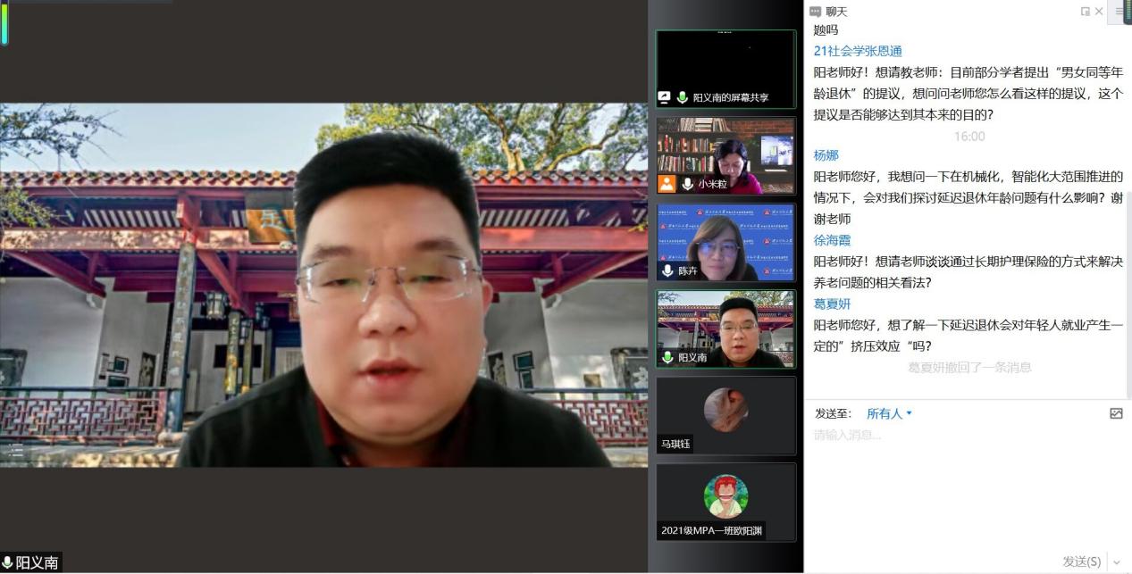 2021年11月18日下午,湖南大学博士生导师阳义南教授在腾讯会议上为银河官网 众师生带来一场名为“中国老龄政策研究的十个认识”的主题讲座。社会发展与公共管理学院师生百余人在线学习。本次讲座由陈卉副教授主持,由戈银庆教授担任讲座评议人。