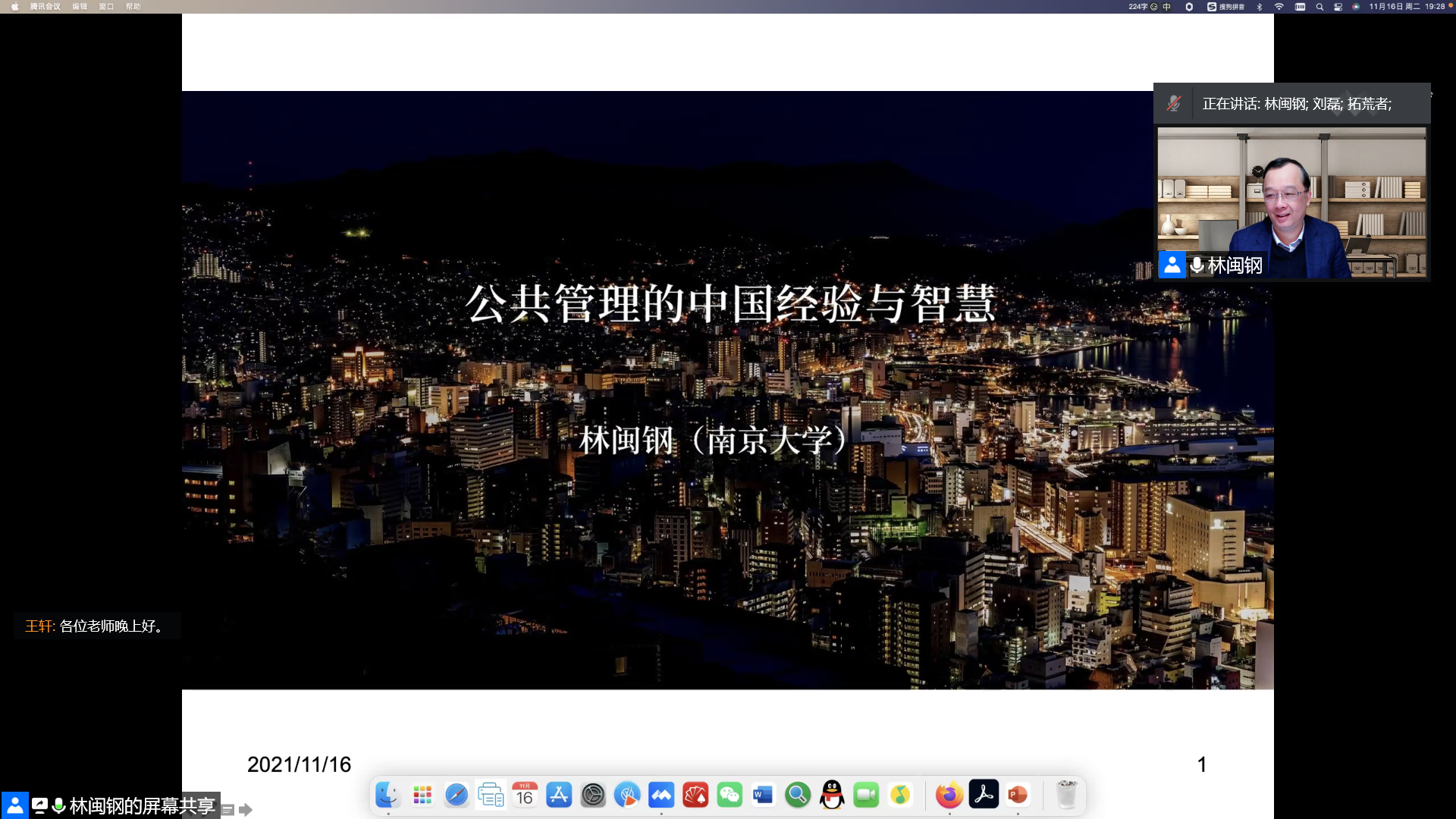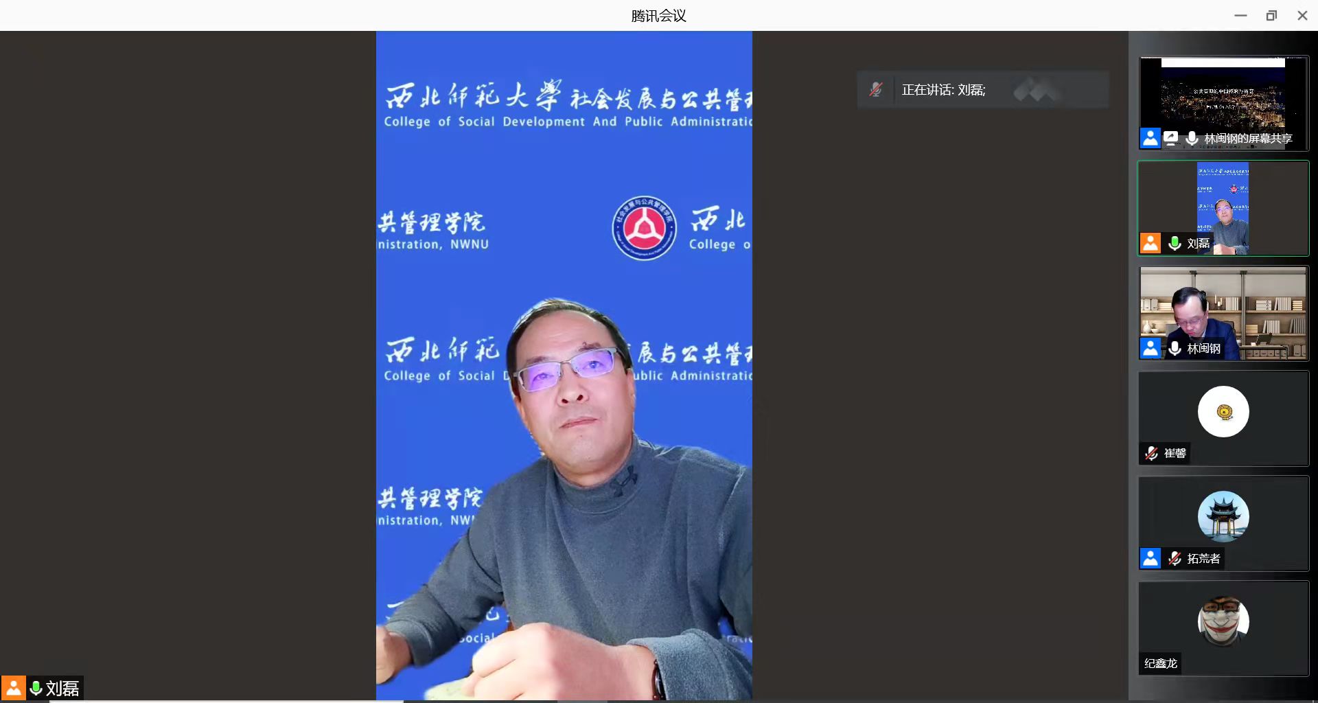 2021年11月16日晚,社会发展与公共管理学院邀请南京大学林闽钢教授开展题为“国家治理的中国经验与智慧”的线上专题讲座。西北师范大学社会发展与公共管理学院全体研究生和本科生参加了此次讲座。银河官网 刘磊副教授担任主持人,张文礼教授担任评议人。讲座正式开始前,林教授首先对银河官网 师生表达亲切的问候,并且期望疫情早日结束,大家能够回归正常的生活。