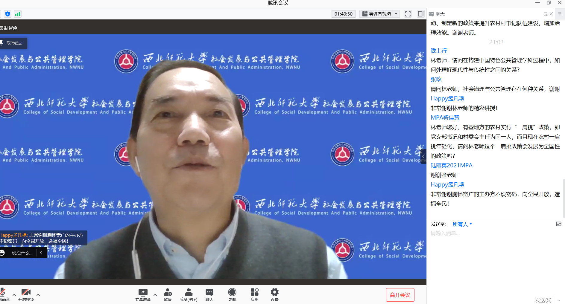 在答疑讨论阶段,林闽钢教授同银河官网 学生进行了精彩的问答互动。高克凡同学提出,“当前农村村书记选拔机制(比如限制年龄、限制户口)等方面是否影响了我国的治理效能,面对现在乡村治理现状,如何采取新的行动、制定新的政策来提升农村村书记队伍建设,增加治理效能”。这个问题引发了参会学生的广泛思考,大家在听了林教授的解答以后也积极提出自己的见解,线上讲座浓厚的学术氛围让林教授更加期待能够亲自来兰州与西北师范大学师生进行一次面对面的学术交流。最后,张文礼教授代表西北师范大学全体师生感谢林教授的精彩分享,为大家贡献了一场丰富的学术盛宴。