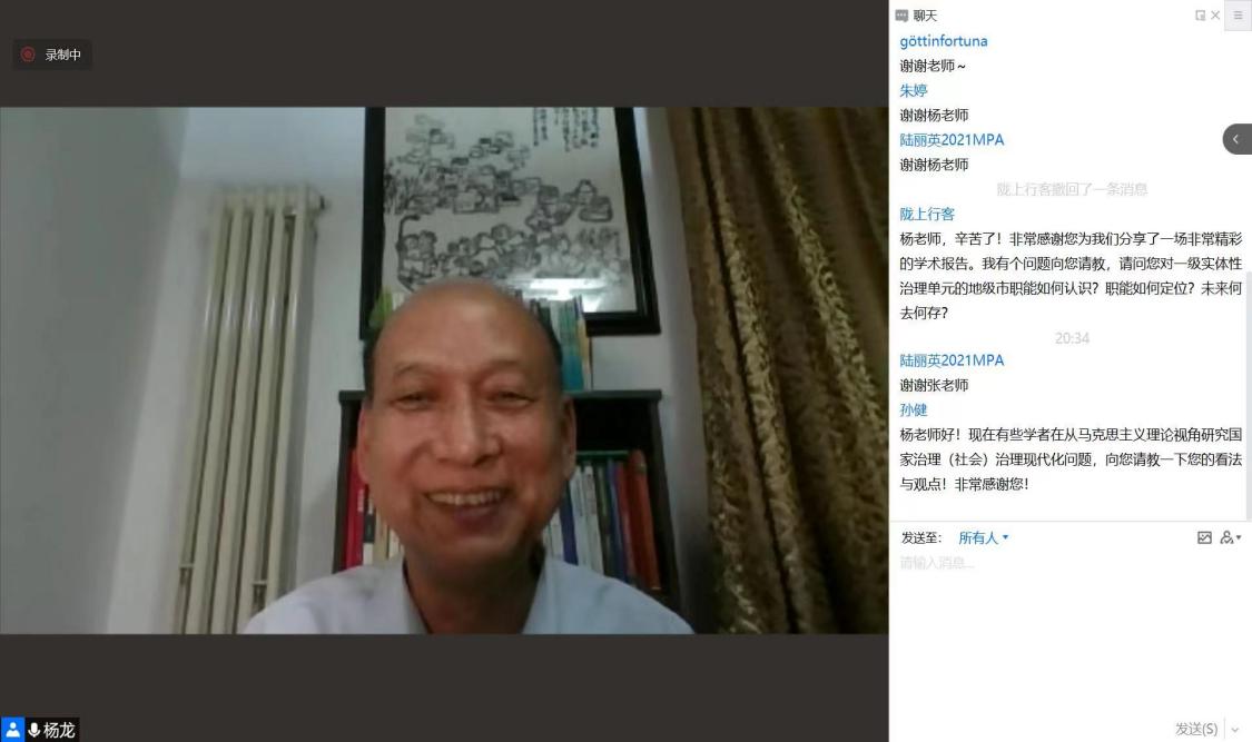 随后,银河官网 师生与杨老师积极互动,提出了“如何认识地级市职能”、“如何从马克思主义理论视角研究国家治理现代化”等问题,杨老师也一一进行了深入回应。银河官网 刘磊教授对本次学术讲座进行了总结,提出这一次讲座对银河官网 师生来说是一次难得的学习交流机会,期待杨老师以后再来兰州为同学们现场作学术报告,进一步开拓同学们的学术视野、提高学术研究能力。