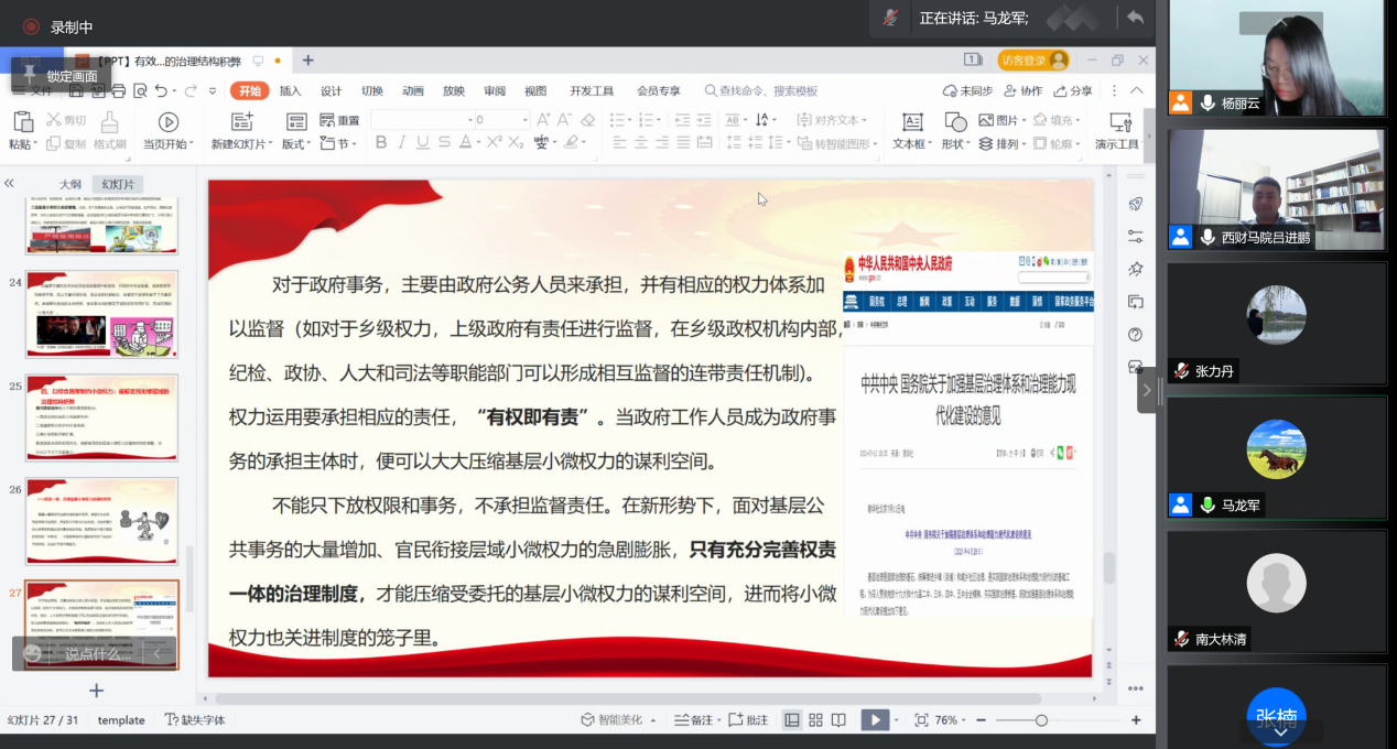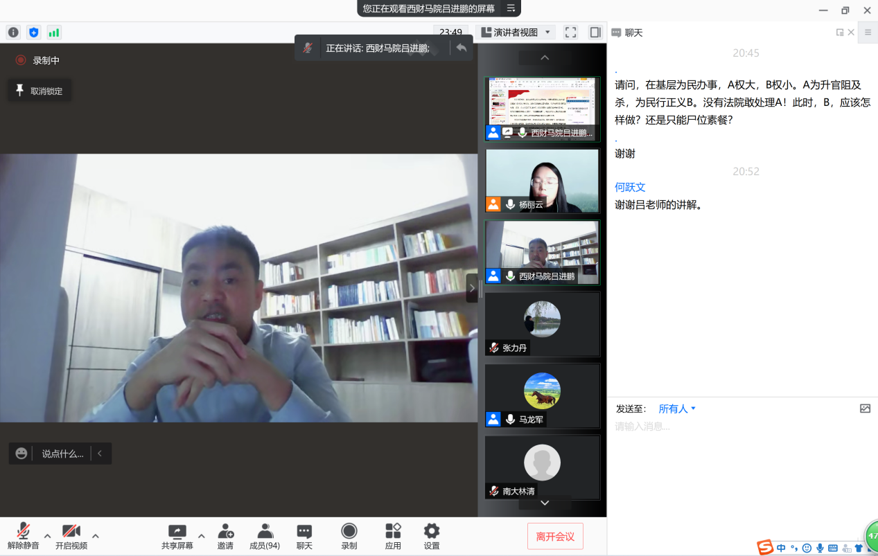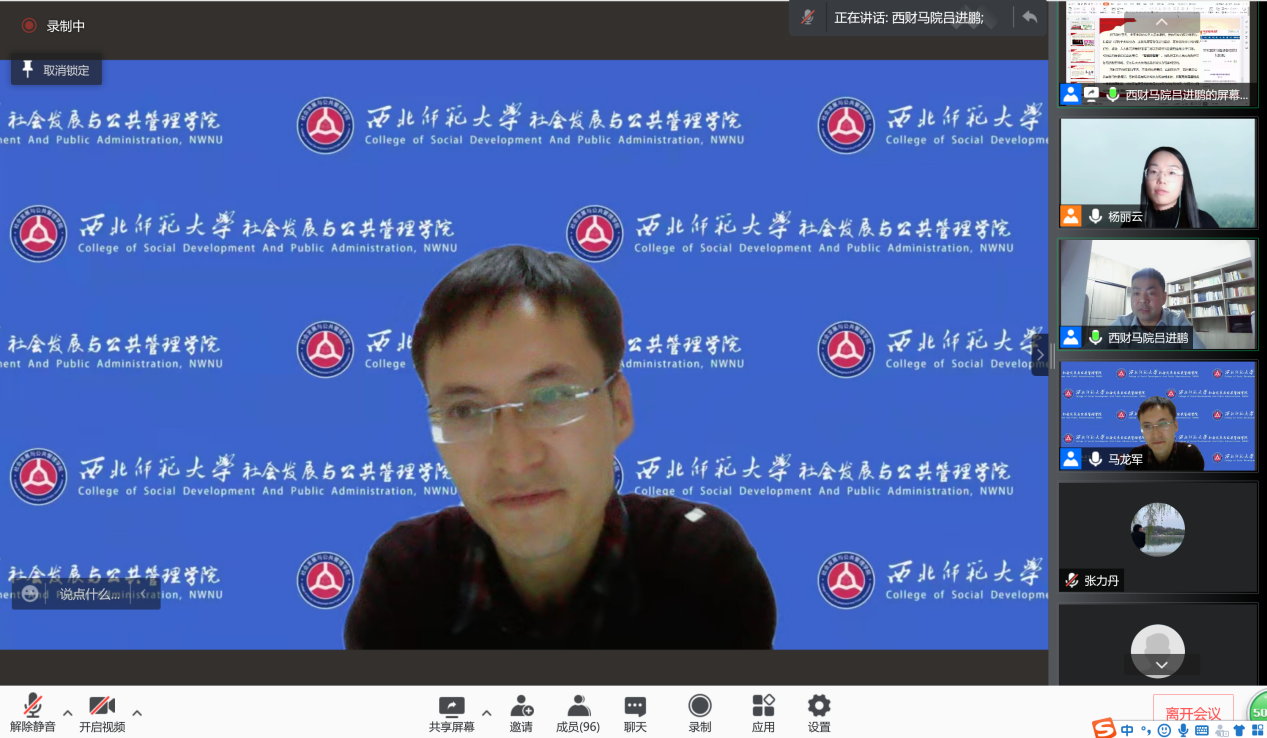 2021年11月29日晚,应银河官网 邀请,西南财经大学习近平新时代中国特色社会主义思想研究中心特约研究员吕进鹏通过腾讯会议为西北师范大学社会发展与公共管理学院师生带来题为“有效制约小微权力:破解官民衔接层域的治理结构积弊”的学术讲座。本次讲座由杨丽云老师主持,马龙军老师进行评议。