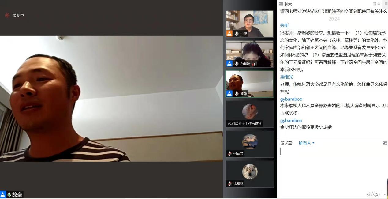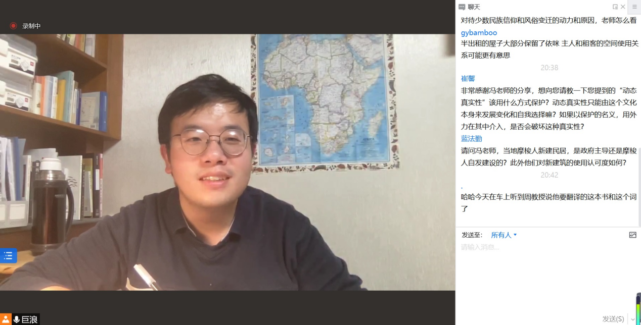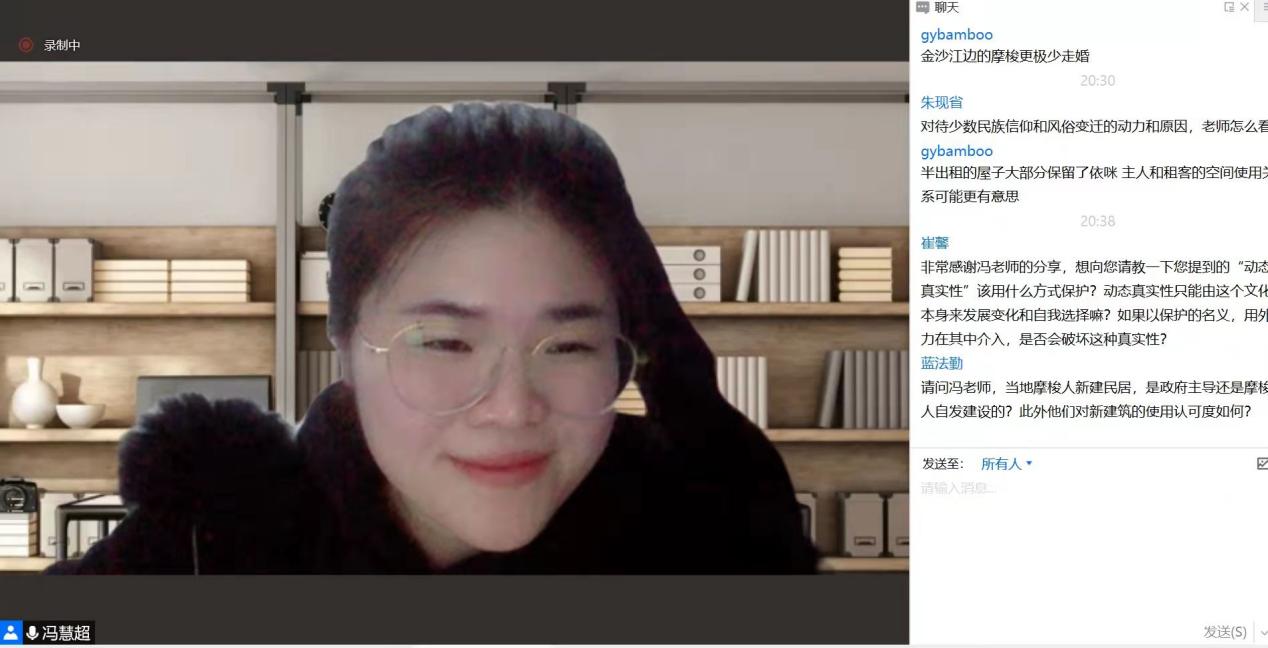 在传统与现代转型过程中,房屋建筑经历了一个变迁的过程。动态的真实性也也逐渐呈现出来,在这个过程中冯老师强调到一个核心概念“文化建筑资产”,主要通过四个参数来解释这一概念。在研究摩梭居民的动态真实性变化时,冯老师运用参与式观察、摄影调查和照片引导访谈三种方法来展开。研究了解到摩梭居民的变化主要体现在建筑文化这一层面,摩梭居民的延续主要体现在居住文化、价值观和信仰两个层面。冯老师最后也提到如果没有疫情影响可能今年还会去一趟摩梭居民的村落做进一步的调研。