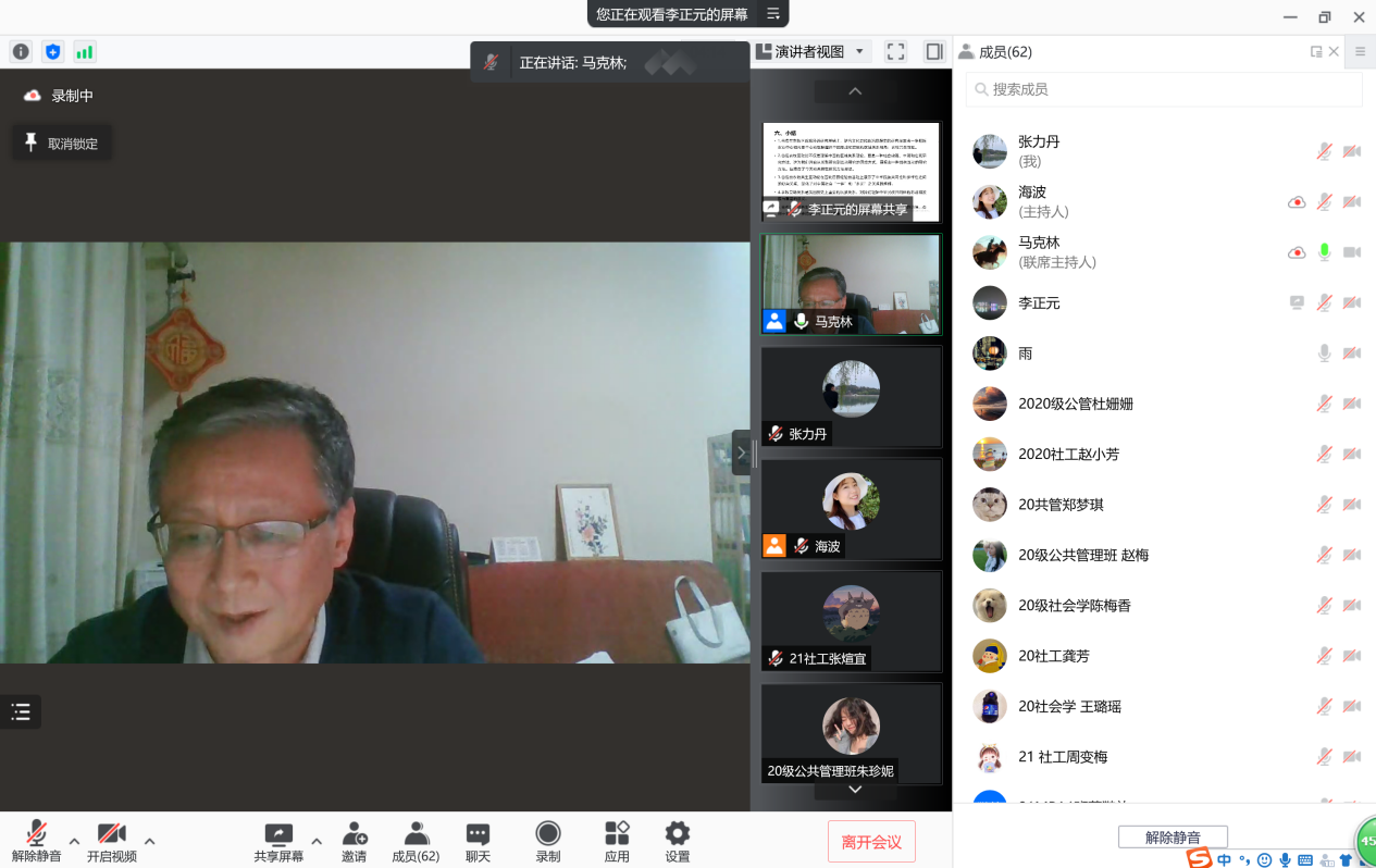 讲座正式开始前,包海波老师简要介绍了人类学自20世纪20年代从欧美国家传入我国后近百年的发展历史,总结了人类学在我国深化汉人乡村社会、侧重少数民族地区研究的实践特征,说明了李正元老师将要呈现的讲座既是人类学中国化发展的结果,又是持续推进人类学对中国独有的历史、独特的社会文化现实进行研究的新视角、新路径的探究介绍。