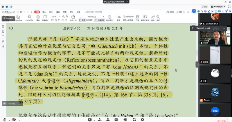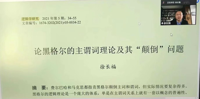 11月22日下午,作为学校百廿校庆学术活动和学院“世界哲学日”系列讲座之一,中山大学哲学系博士生导师徐长福教授应邀通过腾讯会议为全校师生作了题为《谈谈黑格尔的判断理论》的学术报告。哲学学院常务副院长姜宗强教授主持报告会。学院师生及校内外哲学爱好者百余人参加报告会。