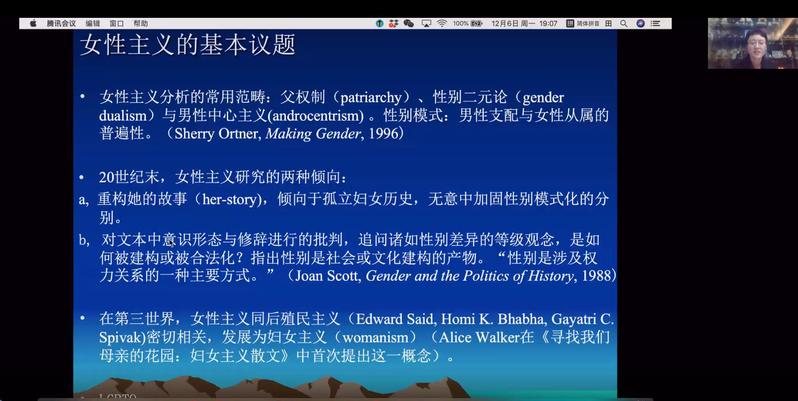 2021年12月6日晚,作为学校百廿校庆学术活动和学院“世界哲学日”学术活动之一,四川大学道教与宗教文化研究所田海华教授应邀通过腾讯会议为全校师生作了题为《女性主义批评与经典诠释》的学术报告,哲学学院孙玥博士主持报告会。