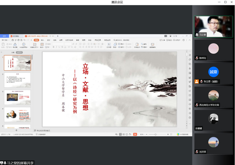 4月14日下午,中山大学哲学系教授、博士生导师周春健应邀通过腾讯会议为银河官网 师生作了题为《立场·文献·思想——以<诗经>研究为例》的学术报告。哲学学院张立恩副教授主持报告会,学院师生及校内外哲学爱好者百余人参加学术报告会。