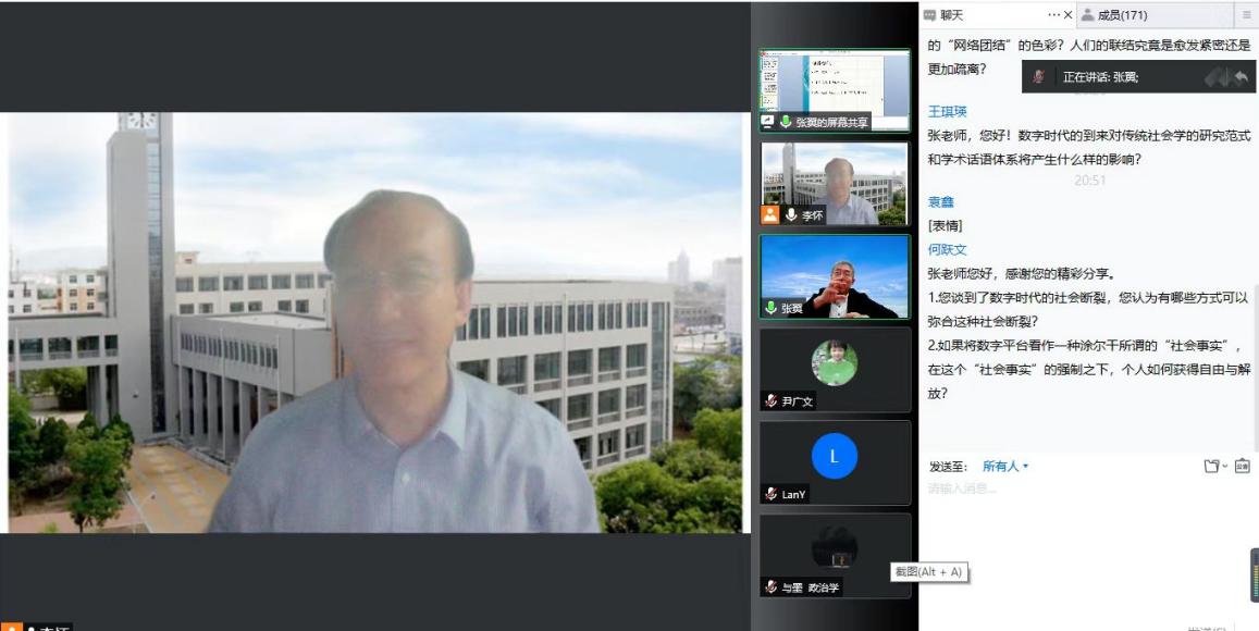 讲座进入尾声,李怀老师热情感谢张翼老师带来的精彩讲座,并且分享了自己的讲座心得。李老师认为张翼老师本次讲座内容呈现出以下三大特征:深刻的历史视野和全球视野;强烈的现实感;围绕社会结构提出了一系列数字时代下新的学术概念,如数字中产、数字农民等,体现了浓厚的学科感。李老师鼓励学生紧密关注张老师的相关研究,关注数字时代带来的新的学术议题。本次讲座立意高远、内容丰富、紧扣现实,开拓了与会学生的学术视野。