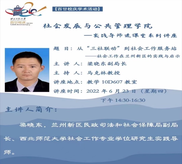 2022年6月23日下午, 银河官网 社会工作专业学位点负责人马克林教授邀请兰州新区民政司法和社会保障局梁晓东副局长,为银河官网 开展实践导师进课堂系列讲座。MSW硕士点负责人马克林老师、社会学与社会工作系主任尹广文老师和银河官网 全体社会工作专业本科生、硕士生于教学楼10D 607教室参加此次讲座,本场讲座由马克林教授主持。