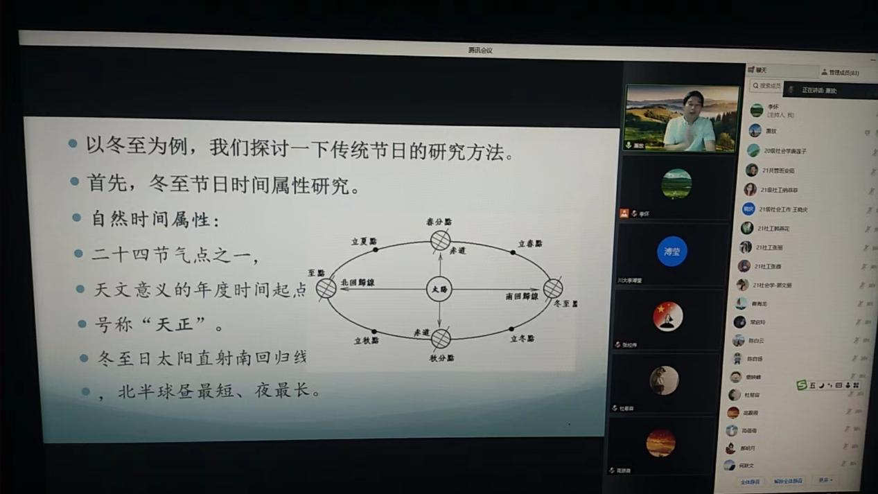最后,萧老师重点呈现了传统节日的研究方法。他指出,对传统节日的研究有形态研究、属性研究与历史研究等不同角度,因为研究视角不同,因而在研究方法的选择上也各有侧重。形态研究可以从内部形态结构和外部形态两个视角出发,需要使用结构分析法与文化分析法;属性研究需要对其文化属性进行分析研究,采用的是文化分析法;历史研究则主要使用文献研究法与过程分析法。接下来,萧老师以冬至这个传统节日为例,展示如何从不同角度出发对冬至节进行科学研究。在这个过程中,萧老师不仅使用丰富的历史文献资料作引证,而且分享了许多相关的民间饮食与习俗传说,为讲座更增添了一份趣味。