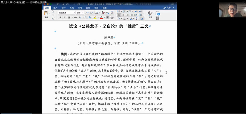 2022年10月20日晚,“中和论道”第八十七期“试论《公孙龙子•坚白论》的‘性质’三义”通过腾讯会议在线上如期举行。