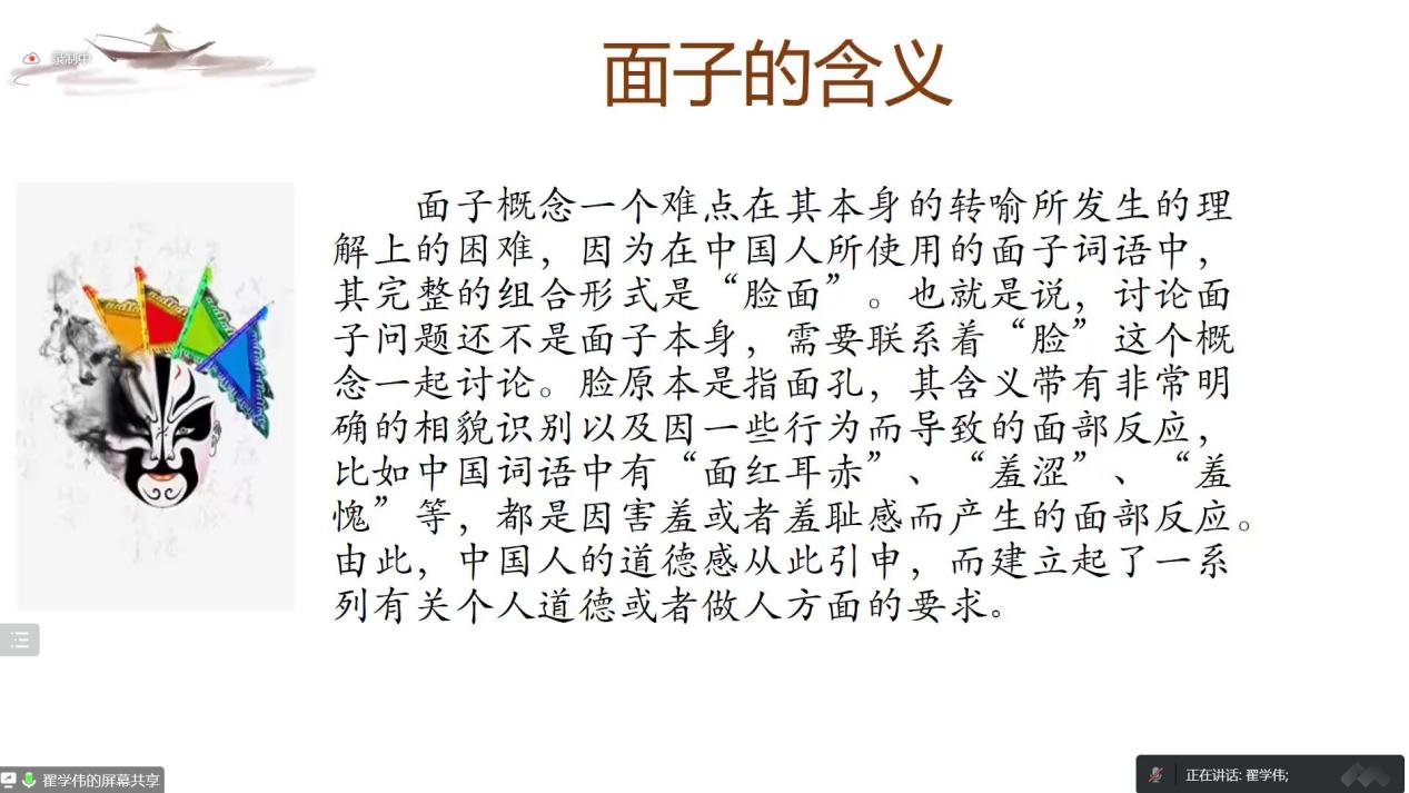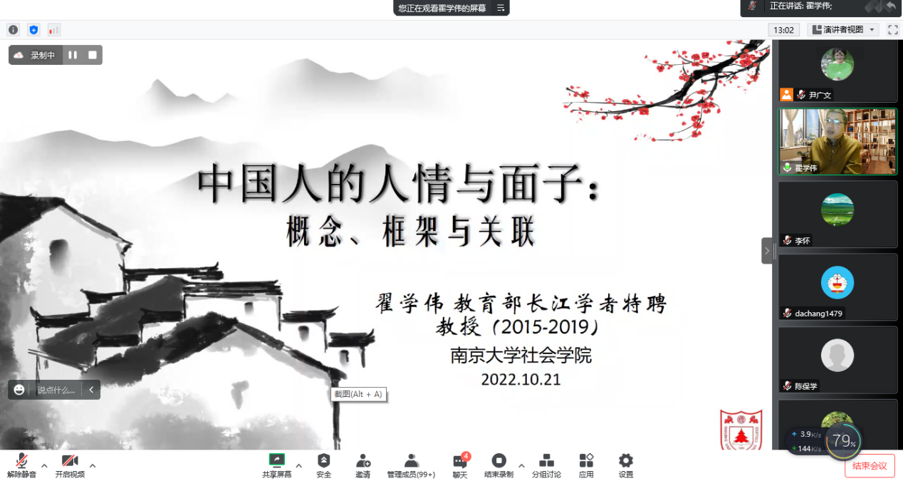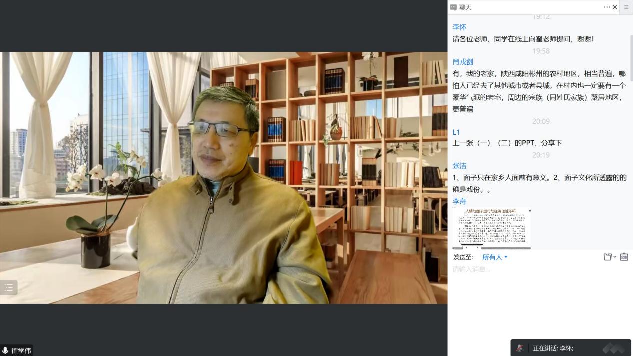 最后,银河官网 师生与翟老师进行了积极互动,同学们对中国人情和面子及相关问题提出了疑问,翟老师做出了耐心解答。在讲座尾声,李怀老师对翟老师的精彩讲座表达了衷心的感谢,并做总结点评,第一个方面是该主题的历史追溯,让老师同学们了解了这个主题的起源与发展;第二个是通过中西方的对比更加深入的了解人情和面子;第三个是从经验视野出发,扎根于中国本土化的研究;第四个是从批判的视野出发,学术研究的推进和中国的实际情况都需要批判性思维。最后诚挚邀请翟老师在疫情结束后来西北师范大学做线下讲座,进行更深入的学术交流与探讨。