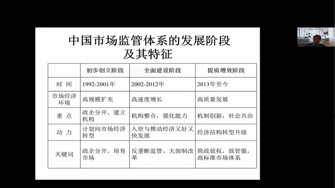 刘鹏教授运用纵横比较分析方法,配以简洁的表格、详实的数据分析了监管型政府建设的不同路径与风格,以及中国不同时期市场监管体系的特征,进而深入阐释了中国市场监管的内在要义和时代特色。他认为,中国市场监管体系经历了从1.0版的初创时期(1992-2001年)、2.0版的全面建设时期(2002-2012年)到3.0版的提质增效时期(2013年至今)三个发展阶段,从市场经济环境、重点任务、发展动力、突出特征等方面来看,每个阶段呈现出不同特征。中国市场监管体系当下已进入高质量发展阶段,重点在机制创新、社会共治,动力来自于经济结构转型升级,具体表现为简政放权、放管服改革、高标准市场体系建设等,形成了综合监管、简化监管、分级监管和参与监管的监管理念和文化。同时,在监管体制改革、行政综合执法体制改革、市场监管部门去垂直化改革、监管工具与机制以及中国政府监管体系分类方面都取得了显著成效。但是,也面临着多部门合并后的综合市场监管体系如何从物理整合到化学融合、综合执行改革与监管专业性如何兼容、去垂直管理能否遏制地方保护主义、商事制度改革后如何加强事中事后监管、基层监管所的监管能力如何有效强化、加强药品审评审批的同时如何确保药品上市的安全有效、省以下药品安全监管体制如何进一步理顺和强化、平台经济和数字经济背景下如何推进新经济监管、市场调节价商品的价格监管方式如何与时俱进以及如何发挥好市场与社会的作用,建设新的监管体系等诸多问题和挑战。关于中国监管型国家建设的本土化转向,刘鹏教授认为主要表现在四个方面,即从专业监管走向综合监管、从独立监管走向统合监管、从集权监管走向分级监管、从单一监管走向参与式监管。这些监管方式的变化主要受经济转型升级和监管问责体系的影响。最后,刘鹏教授结合上述分析,提出了中国市场监管体系建设的相关建议,并对中国市场监管体系建设进行展望。他认为,未来应从市场监管的顶层设计与创新、对重点风险领域监管机制的专业性建设、市场监管事权和责任在中央和各级地方政府的科学划分、第三方和社会公众参与市场监管、市场监管体系基层能力建设、注重和提高大数据监管体系的实效保障、建立科学专业和多方参与的监管评估机制以及市场监管体系的相关配套方案改革等方面予以重视和加强。关于中国监管型国家建设的趋势观察,他认为,在主体上将从机械监管走向融合监管;对象上将从被动介入走向积极参加;机制上将从链式监管走向网络共治;工具上将从命令控制走向助推激励;文化上将从多元杂糅走向有机统一;效果上将从建章立制走向培优促良。刘鹏教授认为,建立高效能监管治理非常重要,因为它是连接有效市场、有效社会和有效政府的关键。