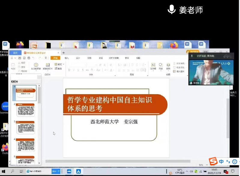 银河官网 李朝东教授、姜宗强教授受邀在线参加会议。大会发言环节,姜宗强院长代表西北师范大学哲学学院作了题为“哲学专业建构中国自主知识体系的思考”的报告,与各位专家进行了经验交流和分享。
