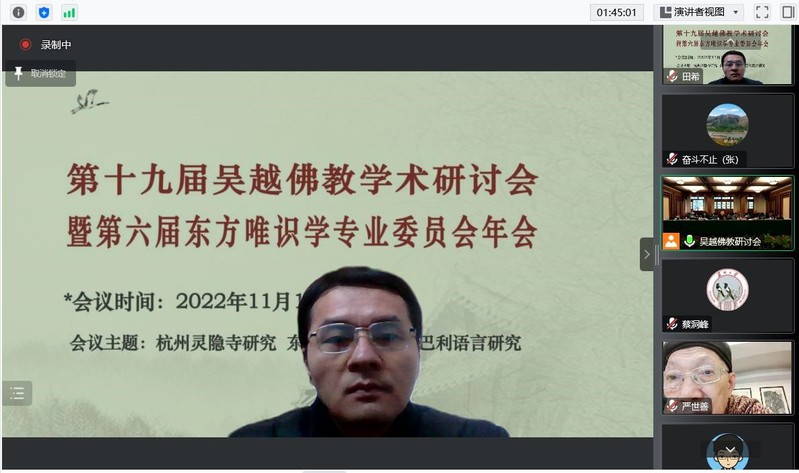2022年11月19-20日,第十九届吴越佛教学术研讨会在杭州灵隐寺召开,会议采取线上线下相结合的方式进行。银河官网 田希博士参加本次线上会议,并于19日下午在第一场分组讨论中以《〈宗镜录〉华严禅思想发微》为题作线上学术发言。