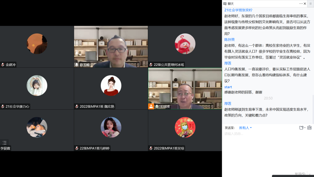 银河官网 师生与赵老师进行了积极互动,同学们对中国人口结构变化与当代青年发展及相关问题提出了疑问,赵老师做出了耐心解答。互动环节结束后,王琪瑛老师总结了自己学习的心得。第一,讲座涵盖了人口学的许多问题领域,每一个部分都可以作为学术选题进行深入分析;第二,讲座不仅对人口学基本理论和方法进行了回顾,并对低生育陷阱、青年社会融合、人口塌陷、人口预测和人口均衡发展理论等学术热点问题贡献了真知灼见。第三,在学术研究中,必须高度重视青年问题的研究。同时,王老师结合自己的体验,讲到如何做一名合格的研究生。希望同学们在问题领域、理论视角和研究方法、技术等层面做好学术训练。讲座尾声,王老师对赵老师的精彩演讲表达了衷心的感谢并诚挚邀请赵老师在疫情结束后来西北师范大学做线下讲座,进行更深入的学术交流与探讨。