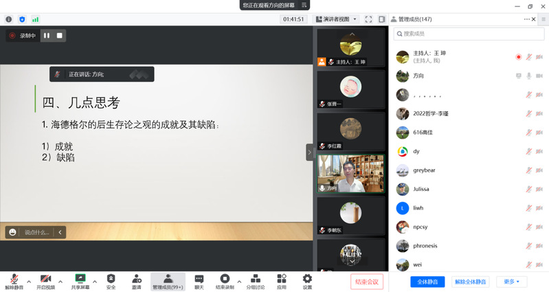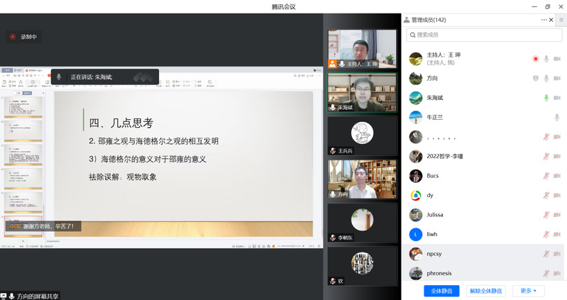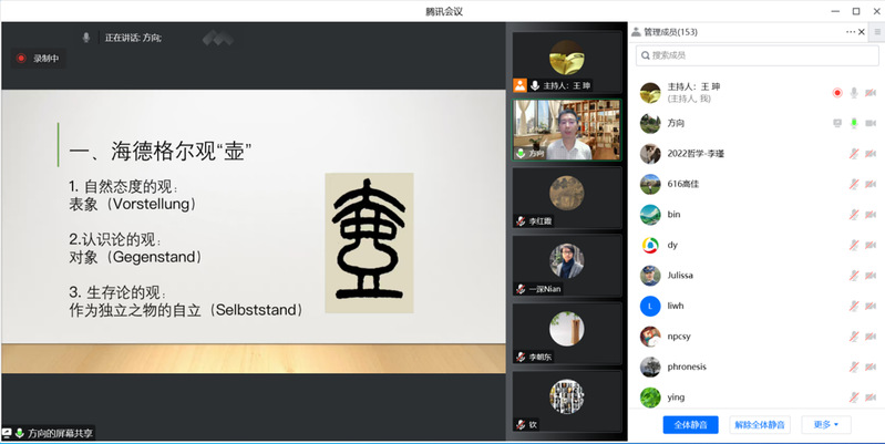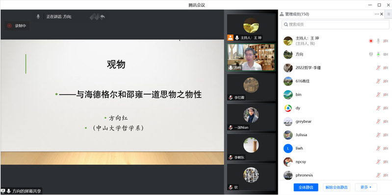 2022年11月17日晚,适逢第20个“世界哲学日”,由西北师范大学哲学学院、中和集团、科学研究院、教师发展中心联合主办的“中和论道”第90期在线上如期举行。本期讲座主题为“观物——与海德格尔和邵雍一道思物之物性”,讲座邀请中山大学哲学系方向红教授作为主讲嘉宾,哲学学院朱海斌副教授作为与谈嘉宾,讲座由哲学学院王珅副教授主持,李朝东教授、孙玥博士、张海龙博士以及校内外的众多哲学爱好者等150余人参加了此次讲座。该讲座也是学校“百廿校庆学术活动”博雅讲堂系列报告之一。