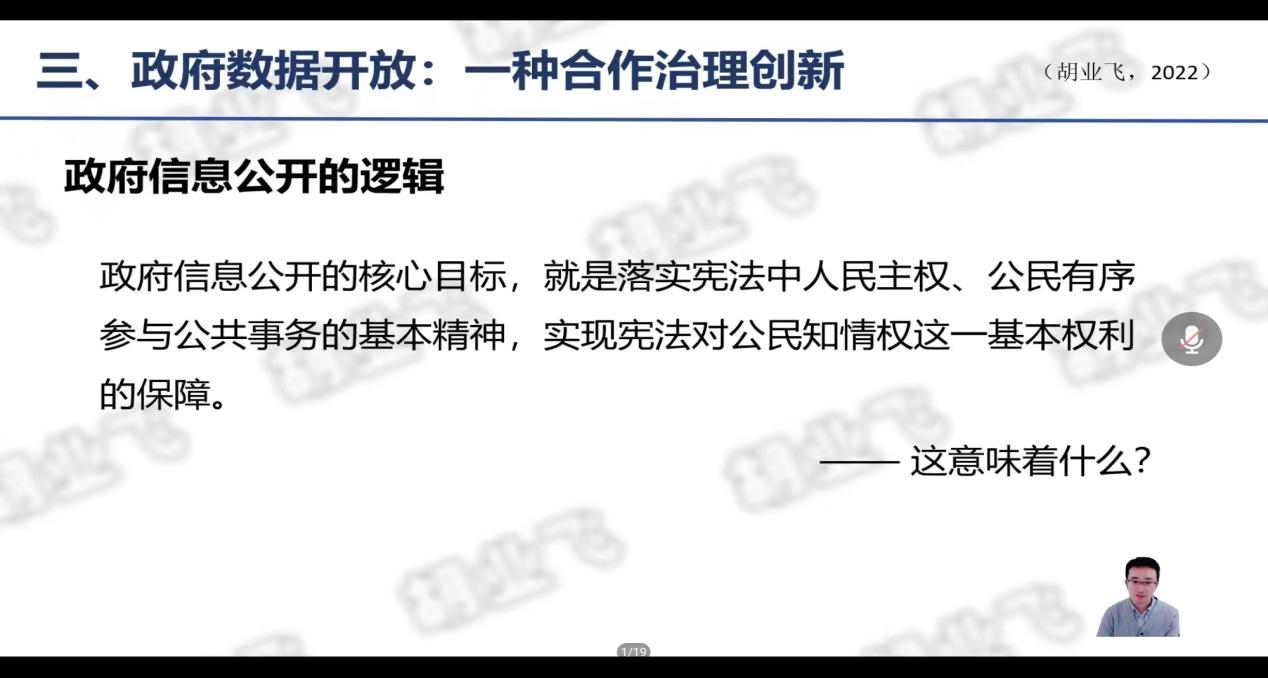 此次讲座,胡老师从三个方面展开讲述:一、大数据时代降临;二、数据要素化;三、政府数据开放:一种合作治理创新。以此来讲述政府数据开放的底层逻辑。