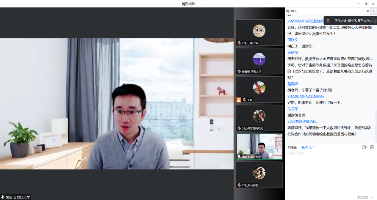 讲座尾声,胡老师与银河官网 师生进行了热烈地交流与讨论,并针对学院师生们提出的问题进行了认真回应。在讨论中,胡老师指出数据共享和数据开放是两个方向,共享的核心是协调的难度,而数据和信息的联系是数据是信息的载体。然后针对本次讲座,王老师向胡老师表达了感谢,并结合自己的体会对本场讲座作了最后总结,王老师指出胡老师从“老年人与诈骗”这一鲜活案例入手,以大数据时代的到临、数据的要素化、政府数据开放:一种合作治理创新这一主线,剥开了政府数据开放的底层逻辑。这样的形式使得本次讲座既轻松又有趣。王老师还指出胡老师不仅对研究问题具有自己的学术思想和理论探讨,而且胡老师对于研究现实热点及难点问题的路径逻辑,值得我们师生共同学习和共同探讨。