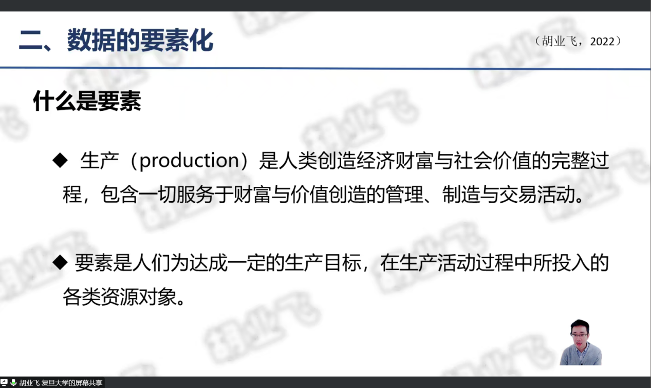 第二,数据要素化。胡老师首先抛出了“谁掌握着最优质数据?”的问题供大家思考。继而讲述了生产与要素的联系,即生产是人类创造经济财富与社会价值的完整过程,包含一切服务于财富与价值创造的管理、制造与交易活动。而要素是人们为达成一定的生产目标,在生产活动过程中所投入的各类资源对象。然后胡老师针对“要素”作了说明,传统的要素是劳动力、土地、资本,党的十五大报告中提出要把技术纳入生产要素之列,“十四五”规划中要把数据纳入生产要素之列。那么数据为何可以作为要素?胡老师以数据的要素属性来加以解释,数据的要素属性(一):投入信息生产,信息在现代社会构成了人的一种直接需求。数据的要素属性(二):其他要素的替代与节约。基于数据的要素属性证明数据可以作为要素来进行生产。