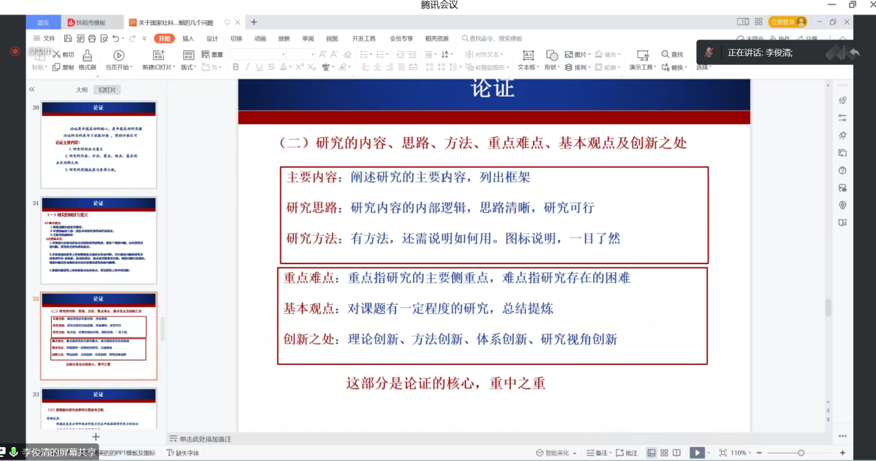 其次,李俊清教授展示了当前国家社科基金项目概况:课题申报范围涉及23个学科;根据《国家社科基金项目2021年度课题指南》,申请人可根据自己的研究专长选择申报(命题作文);基础研究力求具有原创性、开拓性和较高的学术思想价值,应用研究要具有现实性、针对性和较强的决策参考价值;教育学、艺术学和军事学等三个单列学科的申报分别由全国教育科学规划办、全国艺术科学规划办、全军社科规划办另行组织。2022年度课题指南条目分为具体条目 (带*号) 和方向性条目两类。对于具体条目的申报,可选择不同的研究角度、方法和侧重点,也可对条目的文字表述做出适当修改。方向性条目只规定研究范围和方向,申请人要据此自行设计具体题目。同时,只要符合《课题指南》的指导思想和基本要求,各学科均鼓励申请人根据研究兴趣和学术积累申报自选课题 (包括重点课题)。自选课题与按《课题指南》申报的选题在评审程序、评审标准、立项指标、资助强度等方面同样对待。无论是按《课题指南》拟定的选题还是自选课题,课题名称的表述应科学、严谨、规范、简明,一般不加副标题。