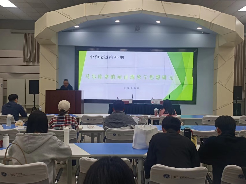 2023年5月11日晚,由西北师范大学哲学学院、中和集团、科学研究院、教师发展中心联合主办的“中和论道”第96期在教师发展中心二楼报告厅举行。本期讲座的主题为《马尔库塞的辩证现象学思想研究》,主讲嘉宾为西北师范大学马克思主义学院副院长马俊峰教授,与谈嘉宾为哲学学院朱海斌副教授,哲学学院王珅副教授主持。