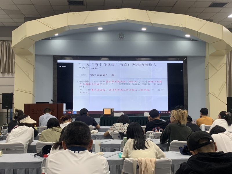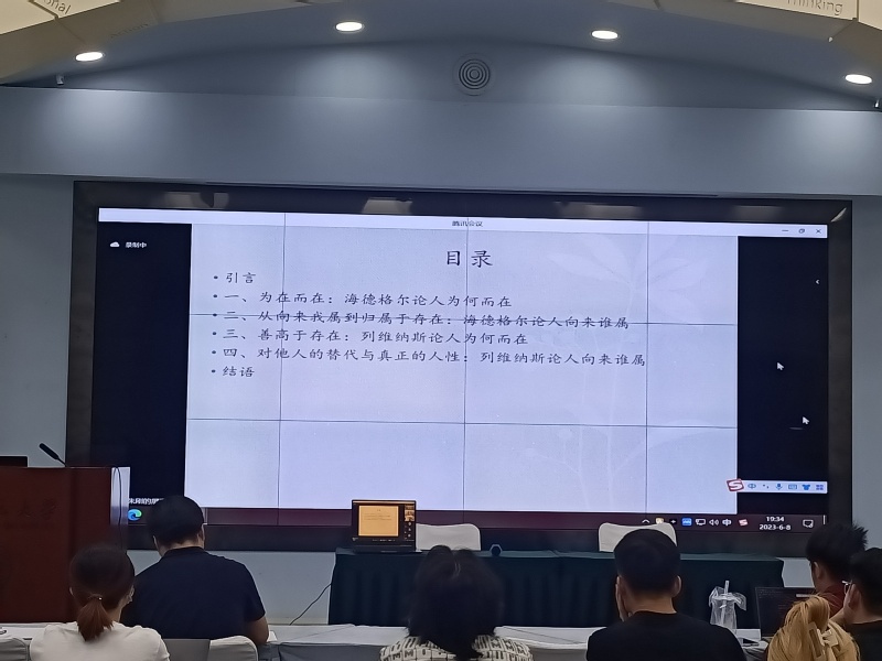 2023年6月8日晚,由西北师范大学哲学学院、中和集团、科学研究院、教师发展中心联合主办的“中和论道”第99期在教师发展中心二楼报告厅举行。本期讲座主题为“为何而在,向来谁属?——列维纳斯与海德格尔关于‘人’之‘本’的‘争辩’”,由中山大学哲学系朱刚教授主讲,西北师范大学哲学学院朱海斌副教授与谈,哲学学院王珅副教授主持。约180人通过线上线下融合方式参加了本次报告会。