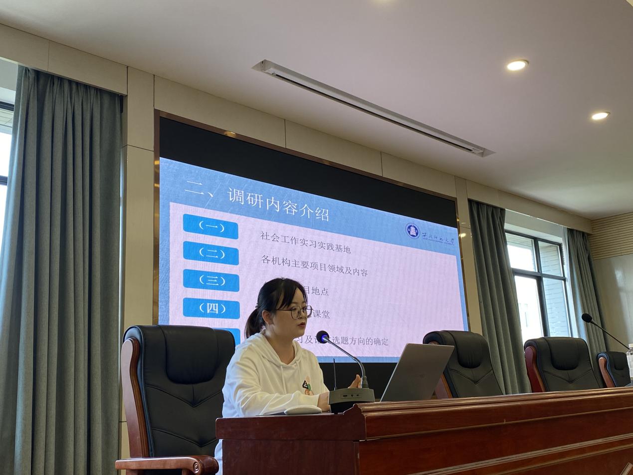 讲座正式开始之前,2022级社会工作班马耀楠同学对本周社会学与社会工作系师生代表“访企拓岗促就业”的走访情况做了详细汇报,具体内容包括以下四个方面:一是调研情况介绍,本调研团队由社会学与社会工作系师生代表组成,调研的主题为“访企拓岗促就业”考察调研,2023年6月5日至9日在兰州市内展开为期五天的调研。二是调研内容介绍,主要对社会工作实习实践基地、各机构主要项目领域及内容、各机构项目地点、实践导师进课堂、毕实习及论文选题方向的确定、毕业生就业岗位等六个方面做了详细介绍。三是调研机构分享,主要涉及到甘肃省社会组织总会、甘肃省社会工作联合会、兰州怡心社会工作服务中心、兰州爱颐社会工作服务中心、兰州心连心社会工作服务中心、兰州爱如阳光社会工作服务中心、兰州美好家园养老服务有限公司、甘肃鸿泽社会工作服务中心、兰州创晖社会工作服务中心、甘肃益群社会工作服务中心、甘肃北辰社会工作服务中心、十里店街道南街社区。四是去年调研机构汇总,主要包括四季青街道社工站、陈坪街道社工站、栖霞中心社区、十里店街道社工站、简公益、沐恩特殊儿童康复中心、甘肃一山一水环境与社会发展中心、兰州欣雨星儿童心理发展中心、兰州德爱社会服务中心等十几家机构。