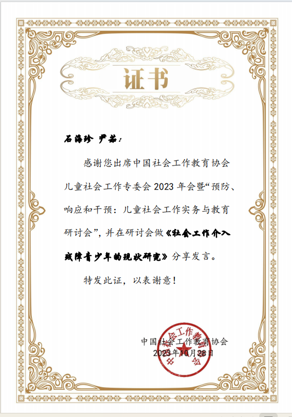 2023年10月28日-29日,中国社会工作教育协会2023年年会分论坛“预防、响应和干预:儿童社会工作实务与教育研讨会”暨2023年“中国社会工作教育协会儿童社会工作专委会年会”于湖南长沙举行。银河官网 2022级硕士研究生石海珍提交的论文“社会工作介入残障青少年的现状研究”入选会议论坛并获邀参会发言。