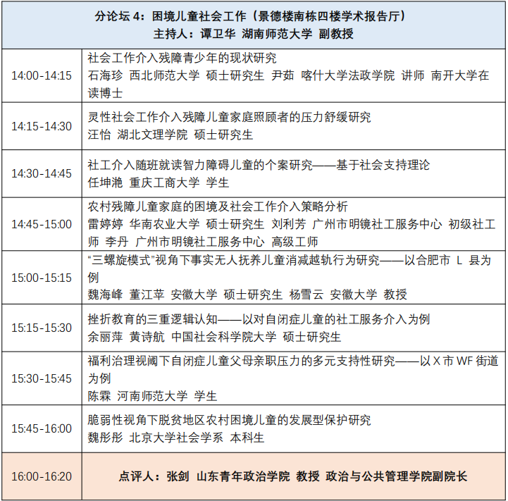 在研讨环节中,研究者们围绕“儿童社会工作理论与政策”“未成年人保护体系”“机构与社工站儿童社会工作”“困境儿童社会工作”“涉罪/未成年人司法社会工作”“留守儿童社会工作”“儿童心理健康与特殊行为问题的社会工作干预”“家庭视域下的儿童社会工作、儿童福利机构社会工作”“儿童青少年成长主题的社会工作”九个议题进行了积极热烈的研讨。石海珍同学在分论坛4进行汇报发言,基于残障青少年的生理、心理、社会特征,对残障青少年面临的困境以及困境产生的原因进行分析,将在个案工作、小组工作、社区工作和个案管理方面的研究进行了综述,最后剖析了社会工作在残障青少年领域发挥巨大作用的原因。山东青年政治学院教授、政治与公共管理学院副院长张剑作为论坛点评人,对论文进行了深入细致的点评,提出了宝贵的建议,最后各分论坛点评人总结及回报研讨成果。