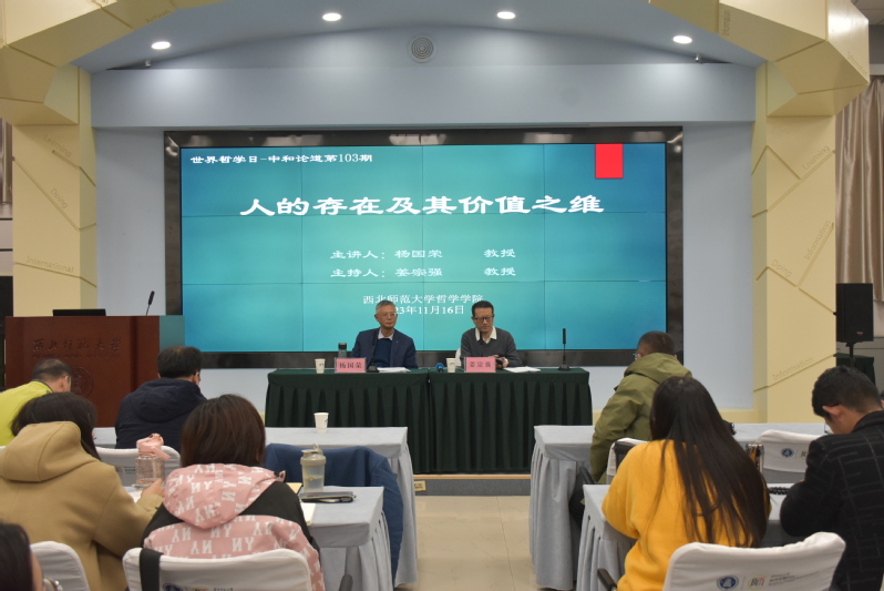 2023年11月16日晚,由西北师范大学哲学学院、中和集团、科学研究院以及教师发展中心联合主办的“中和论道”第103期在教师发展中心举行。本期讲座主题为“人的存在及其价值之维”,由我校国家级高层次人才讲座教授、华东师范大学哲学系杨国荣教授主讲,哲学学院院长姜宗强教授主持。西北师范大学、兰州大学、甘肃省委党校、兰州理工大学、兰州交通大学等院校的师生及哲学爱好者约150余人,现场聆听了杨老师的讲座。