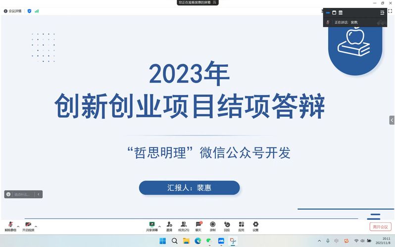 11月8日晚,哲学学院2023年科研立项结项答辩在腾讯会议举行,共两个方向15个小组的同学参与了此次答辩,哲学学院张海龙老师、孙玥老师担任评委。