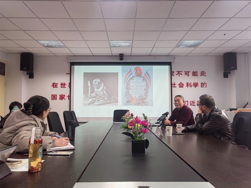 讲座伊始,马天俊教授再次表明了辩证法在马克思思想之中的重要地位,希望借助本次讲座,帮助学友们梳理辩证法的发展脉络,总结辩证法思潮的不同发展阶段及特点。以“后思的辩证法对前瞻的辩证法”为对比方法进行研究学习。马教授用黄昏的猫头鹰示意以黑格尔为代表的、以后思为主要特征的辩证法;又以法国大革命时期日出时分的雄鸡海报,意指与马克思思想有关的、带有前瞻性特点的辩证法。这是意象相反的两种比喻。