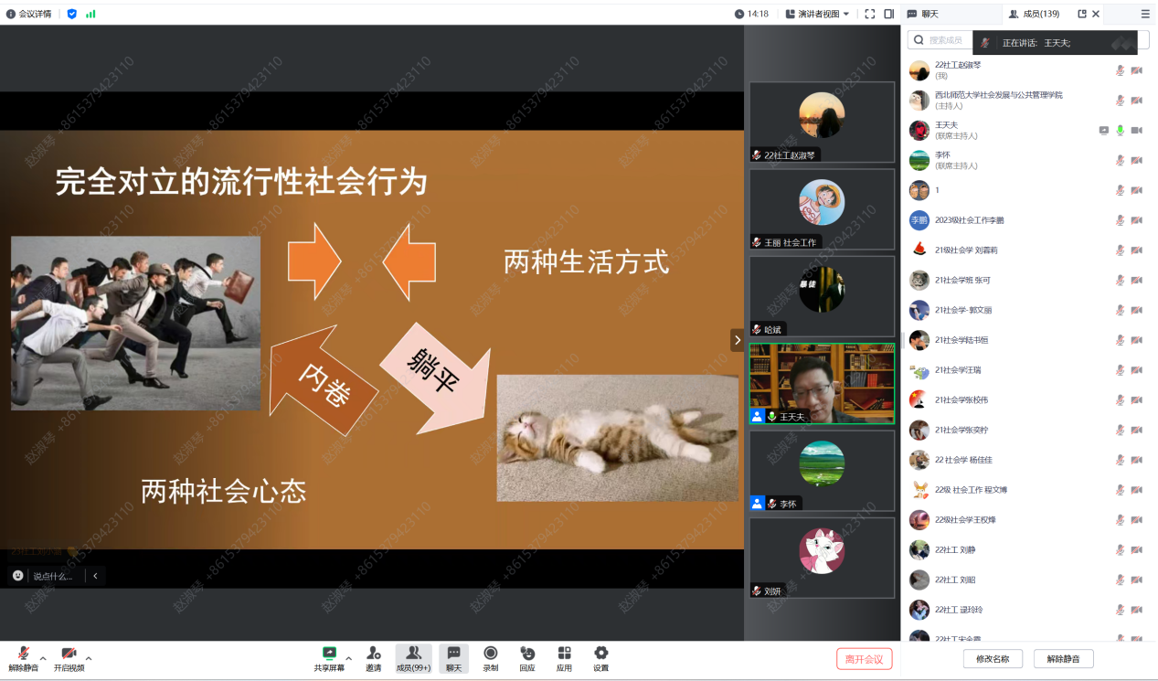 王老师首先阐释了“内卷”和“躺平”两种社会现象,指出内卷和躺平两种集体行为都是一种焦虑。基于焦虑的社会理论,现代社会呈现出不同种类的焦虑现象、焦虑的原因及后果,从而引出对“焦虑”的定义,深入分析了焦虑导致的内卷和躺平两种行为,以及该行为的后果。