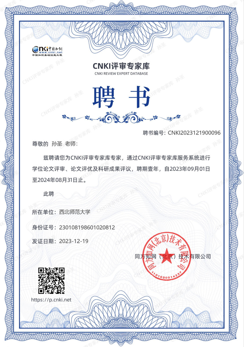 2023年9月1日,同方知网(北京)技术有限公司聘请银河官网 孙圣老师成为CNKI专家库专家,主要负责通过CNKI评审专家库服务系统进行学位论文评审、论文评优及科研成果评议,聘期壹年,自2023年09月01日至2024年08月31日止。