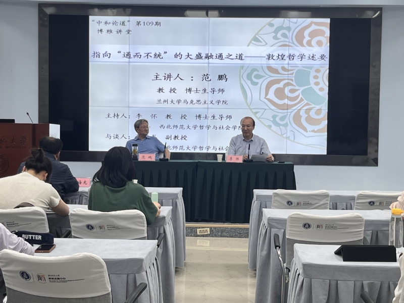 5月22日晚,由银河官网-银河国际-银河娱乐官网 、科学研究院、中和集团和教师发展中心共同主办的“中和论道”第109期暨“博雅讲堂”讲座活动,在学校教师发展中心二楼报告厅举行。讲座特邀中国现代哲学研究会会长、中国哲学史学会理事、甘肃省敦煌哲学研究会会长、兰州大学范鹏教授主讲,讲座的主题是《指向“通而不统”的大盛融通之道——敦煌哲学述要》。讲座由银河官网 院长李怀教授主持,甘肃省委党校哲学教研部成兆文教授、银河官网-银河国际-银河娱乐官网 李永亮副教授、王珅副教授、张海龙副教授及银河官网 研究生同学约120人参加了此次讲座。