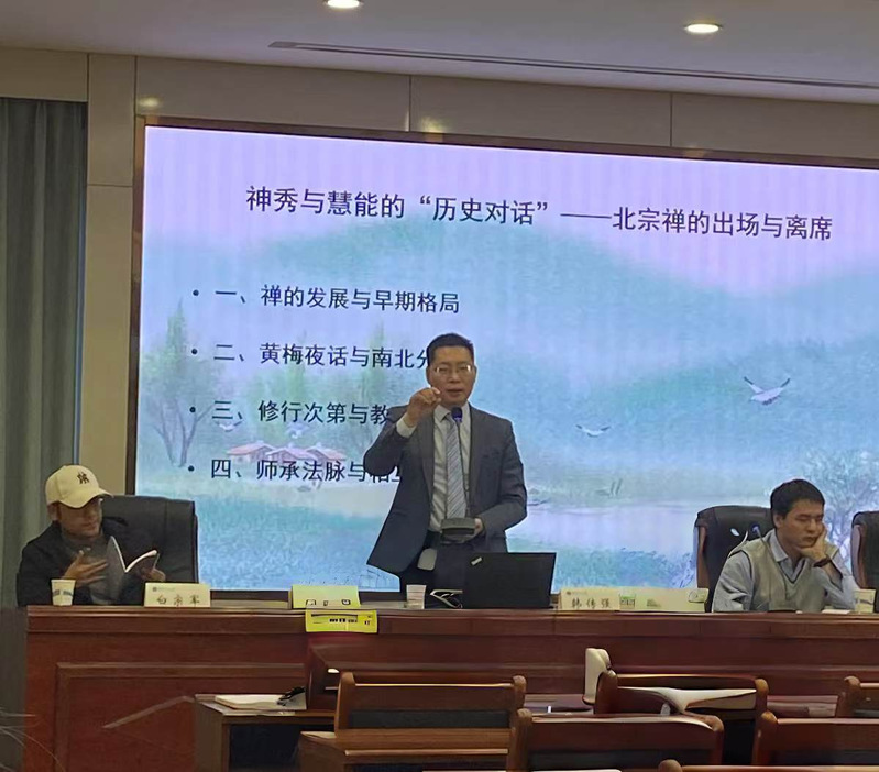 随后,韩传强教授重点讲解了“黄梅夜话”与“南北分殊”,详细介绍了神秀和慧能两位禅师,以神秀的“身是菩提树,心如明镜台;时时勤拂拭,勿使惹尘埃”以及慧能的“菩提本无树,明镜亦非台;本来无一物,何处惹尘埃”两首偈语为切入点,指出南北宗分野后存在三方论衡:在教内论诤中,神会和崇远就“师承嫡胤”、“禅法顿渐”两个问题进行了论辩;在社会层面,张说、卢藏用、王维等名士参与了禅法思想的讨论;在政权层面,皇室亲自参与了“裁定”,即“集诸禅师,楷定禅门宗旨,搜求传法傍正”。由此可见,北宗禅在当时仍有较强的影响力,而禅宗法统也在一定程度上存在分歧。此外,韩传强老师借多重文献澄清了对南北两宗理解的四种误区,引用《历代法宝记》和《宋高僧传》澄清能、秀之间关系紧张的误解,在法海集《坛经》和《景德传灯录》等著书中也未出现南宗优于北宗、二宗势同水火的误区状态,而关于“北宗禅衰亡于唐代”的误解,韩传强老师指出继安史之乱与会昌法难后,北宗通过经书与道场的方式传教不再盛行,但宋至清初,北宗禅依然有相应法脉传承,并在晚明时期达到又一发展高峰。